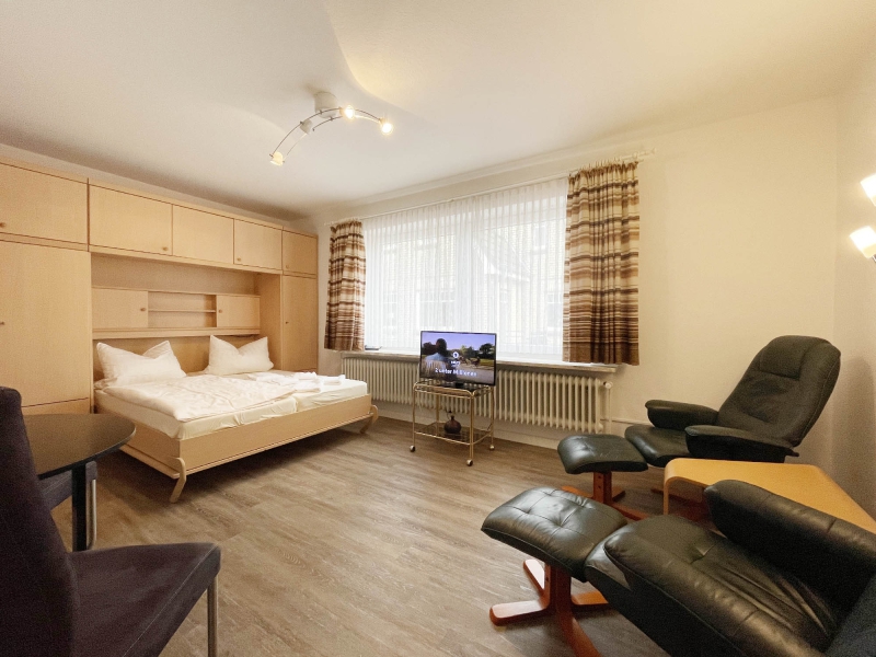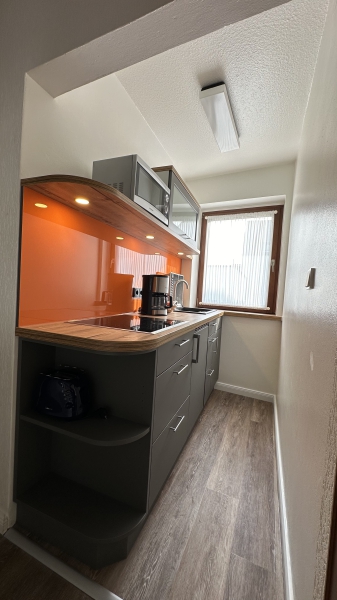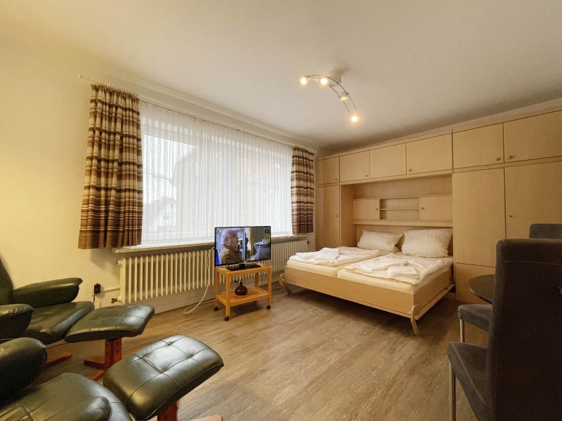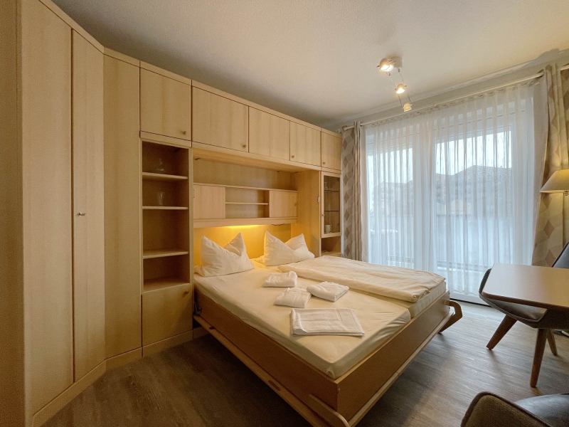 1-Raum Appartement für 1-2 Personen, 1. Etage, Schrankbetten, Flachbild-TV, Telefon, separate Küche, Dusche/WC, Balkon, Nichtraucher